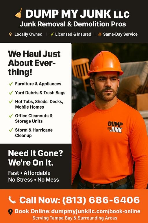 Junk Removal Riverview | Dump My Junk LLC has remained committed to providing exceptional junk removal services in Riverview since 2018. Our expert team manages every project with care and precision, from hurricane storm debris cleanup to construction debris removal and furniture removal. From appliances and yard waste to property cleanouts and even moving junk removal, every task is undertaken with a focus on delivering efficient and hassle-free solutions. We make every effort to cater to your needs with our professional demolition services, which include kitchens, bathrooms, and mobile homes. For your convenience, we speak Spanish.